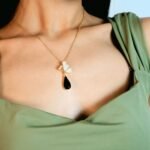 A golden butterfly pendant with a delicate black teardrop charm — a perfect balance of elegance and boldness.